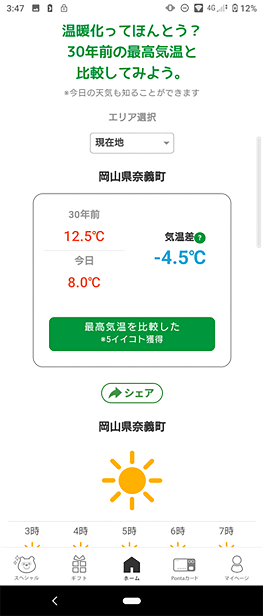 過去の気温と現在の気温を比較すればスコアが貯まります。居住地域の30年前および、現在の気温を比べることで、地球温暖化に対する意識を高められる機能です。気温の比較でスコアを上げつつ、地球温暖化の傾向が確かめられる便利な機能です。