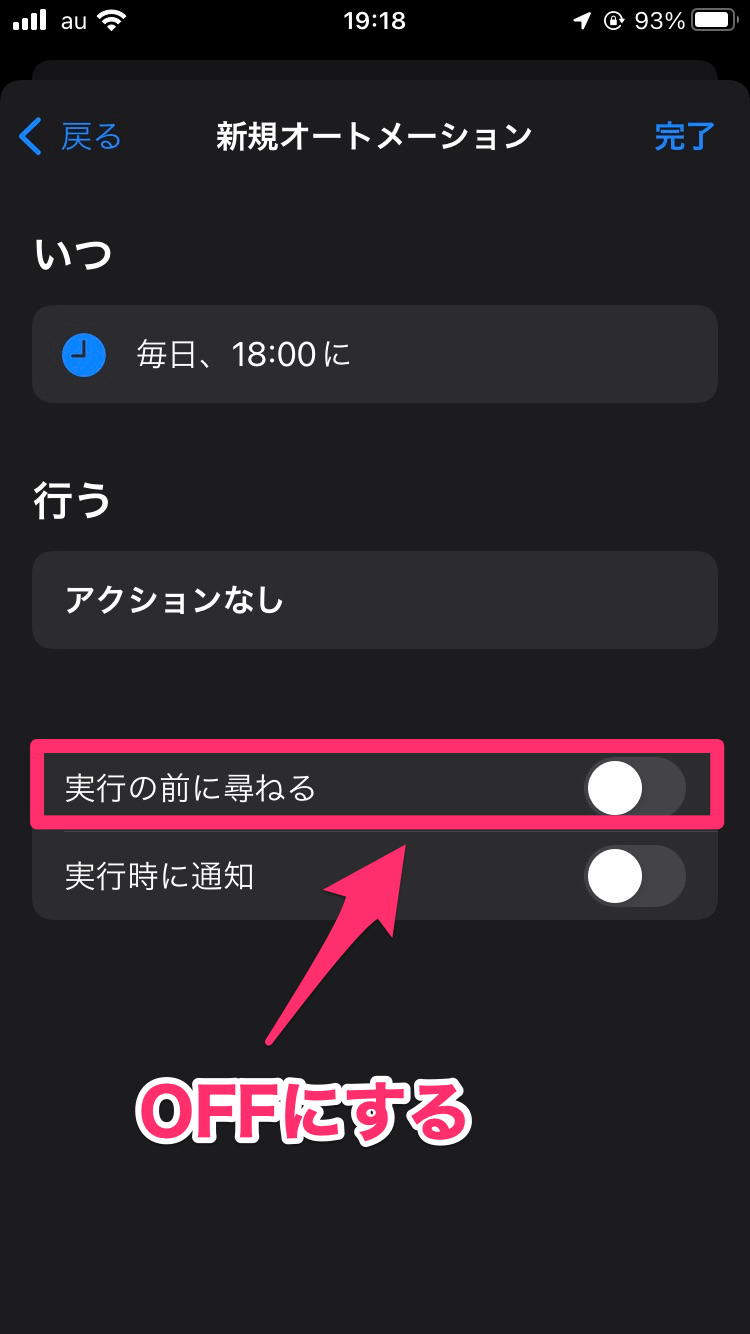 ⑤『次へ』をタッチ→『実行前に尋ねる』をタップ→尋ねないを選択してオフにする→『完了』をタッチします。