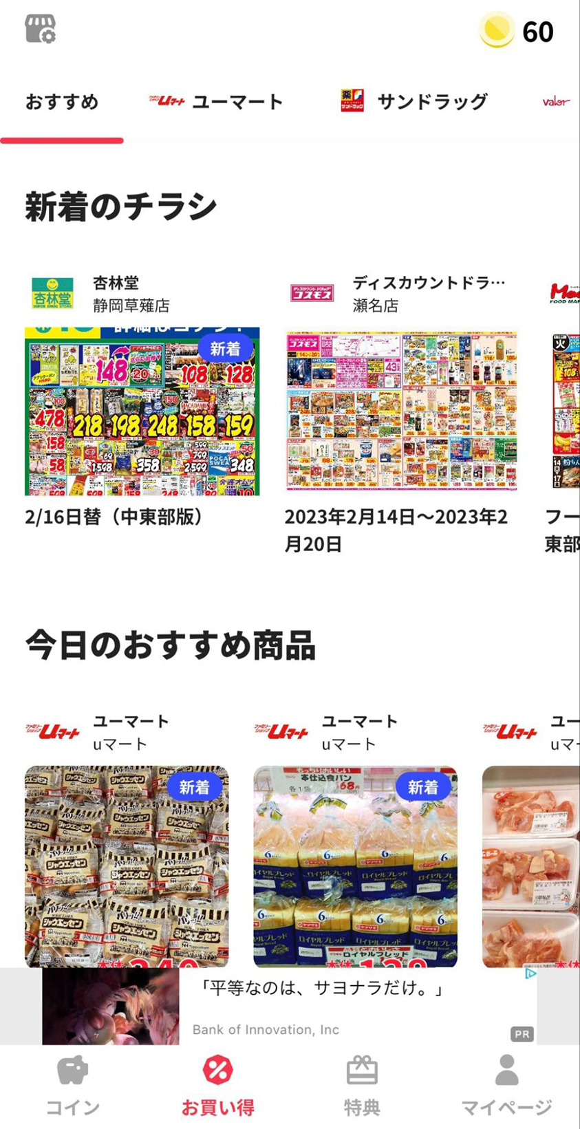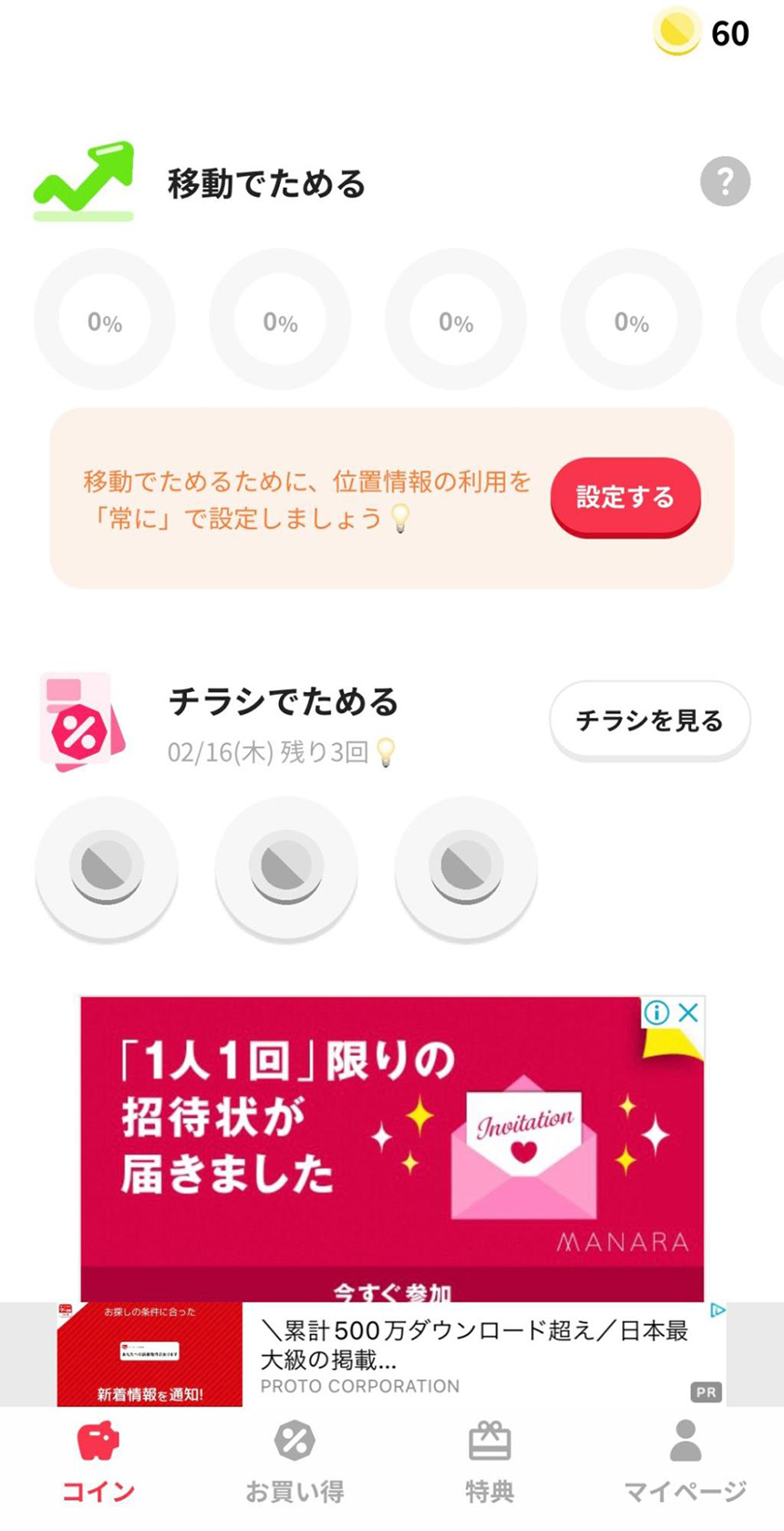 設定が完了すると、上記のように近隣のお店の情報が出てきます。こちらに表示されているチラシを3回閲覧したら、チラシでコインを稼ぐことができます。