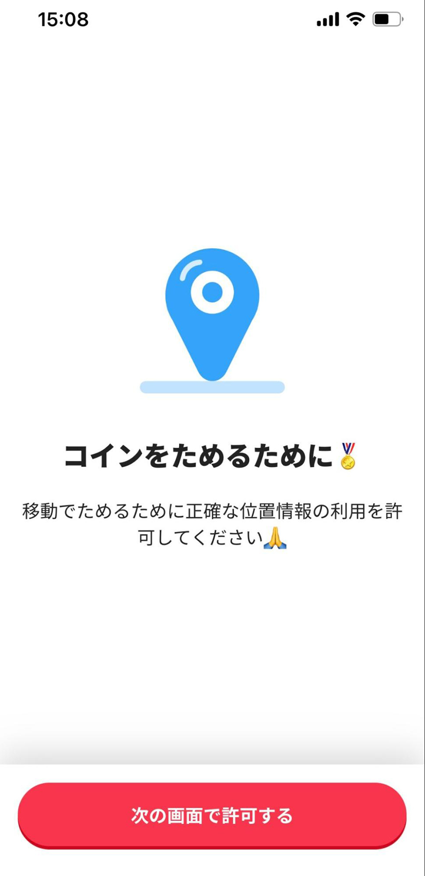 アカウントを作成する前に、位置情報の設定が必要になります。位置情報を設定しないと、距離の設定ができなくなり、ポイントが貯まらないので必ず設定しましょう。