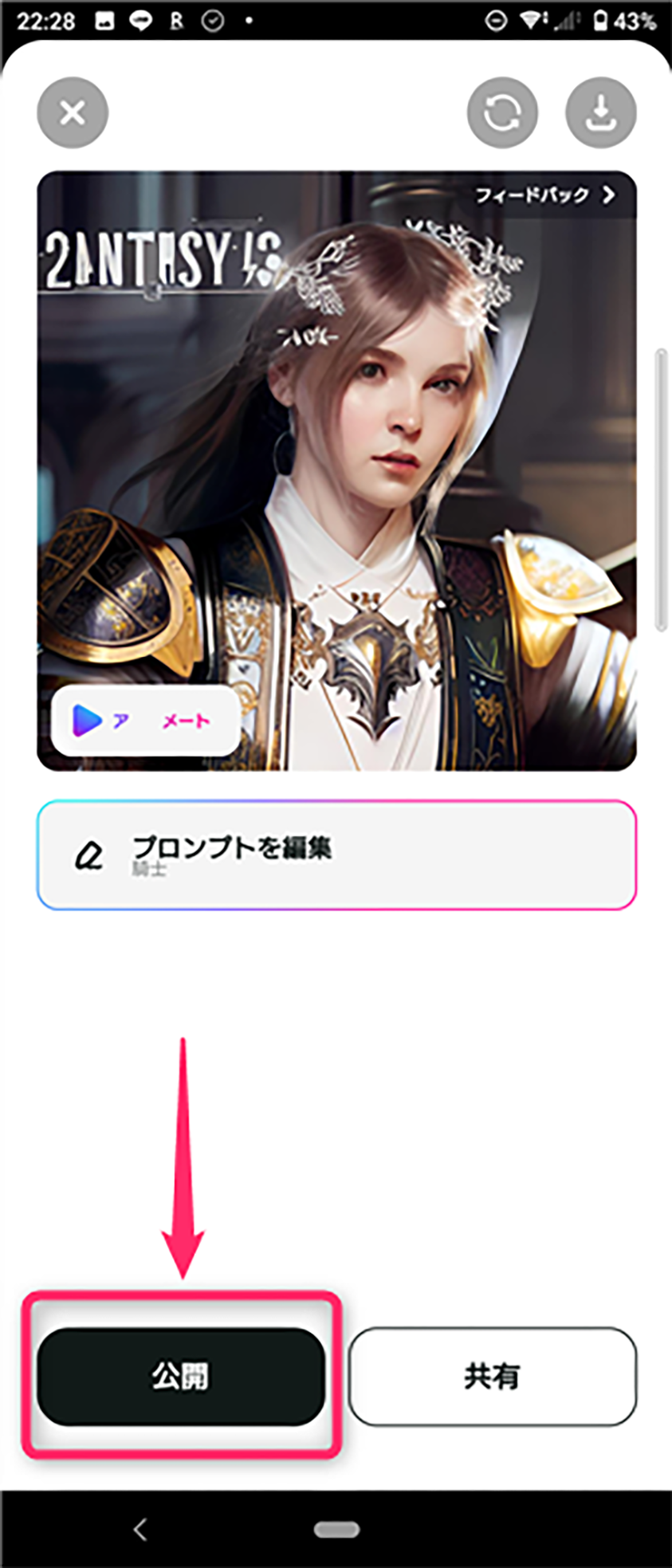 イラストが気に入った方は、作品を投稿してみましょう。「公開」ボタンをタップします。