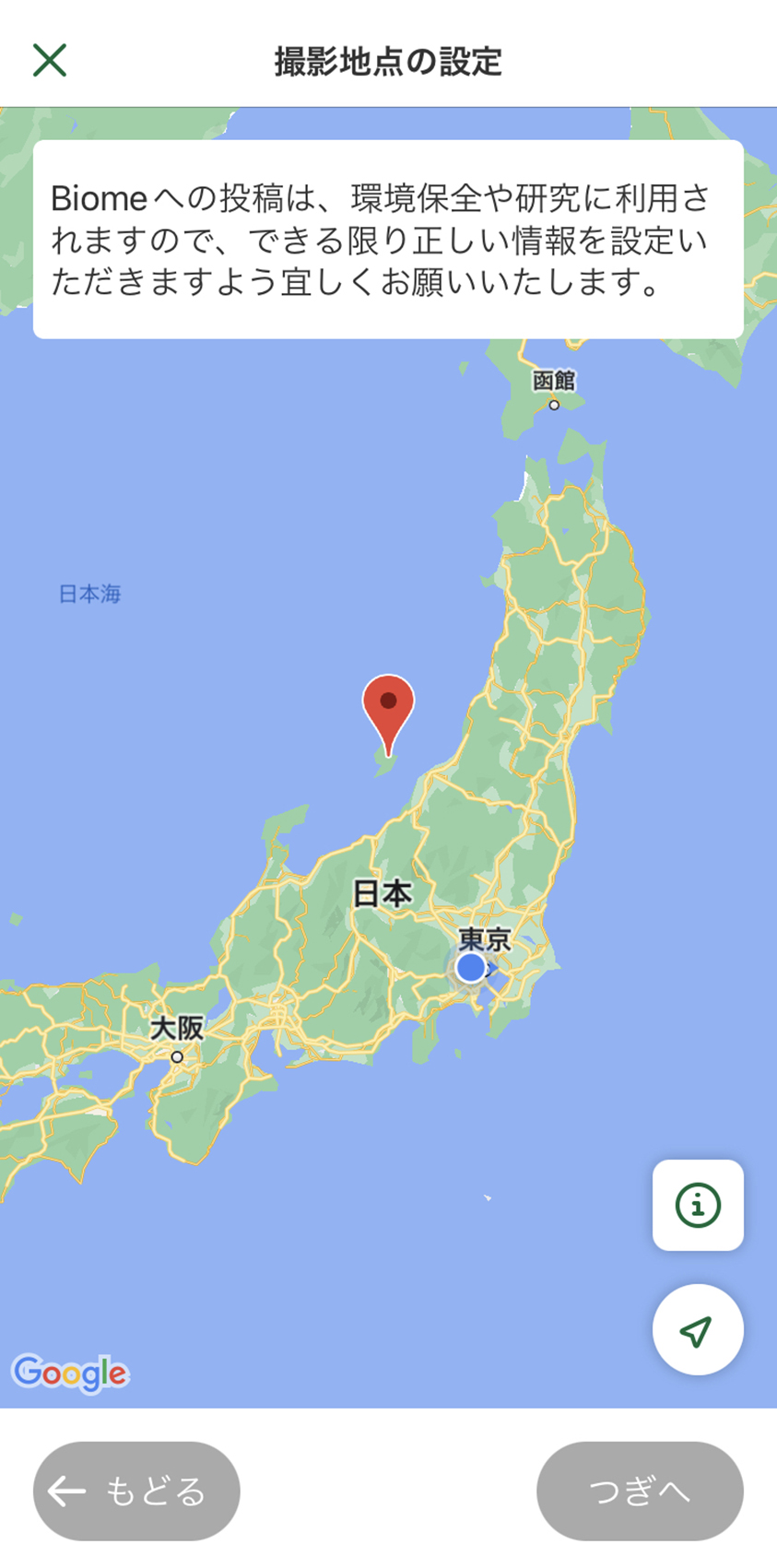 撮影した生き物を正しく判定するために、写真を撮影した場所をなるべく正確に設定していきましょう。位置情報がない写真は投稿できませんので注意が必要です。