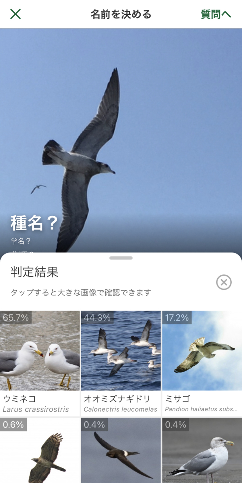 判定結果が表示されます。パーセンテージの高い種目を選択して[この種で決定]をタップします。