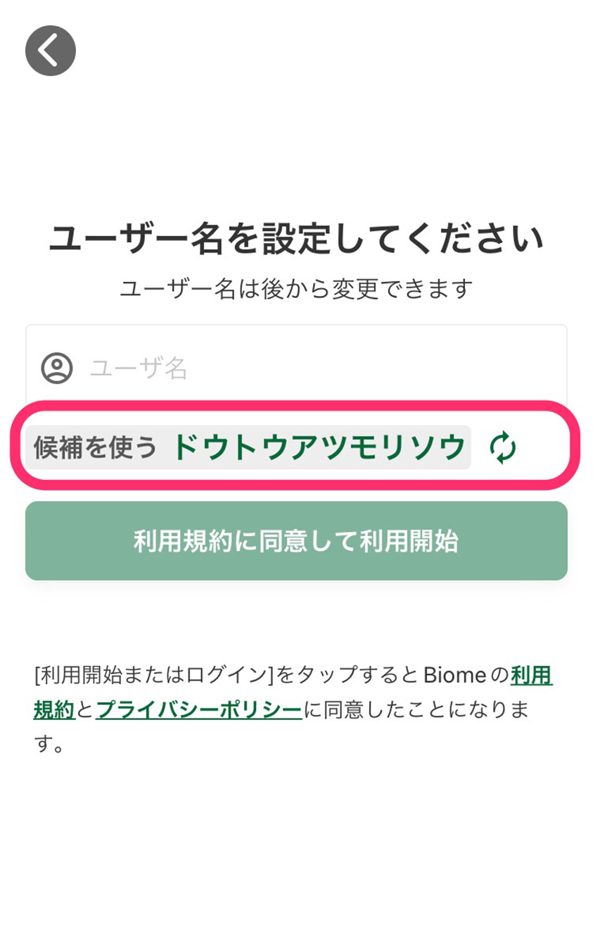 アカウント登録が完了したら、ユーザー名を設定します。自分で入力をするか、[候補を使う]をタップして、好きなユーザー名を決めていきましょう。ユーザー名はあとから変更することもできます。
