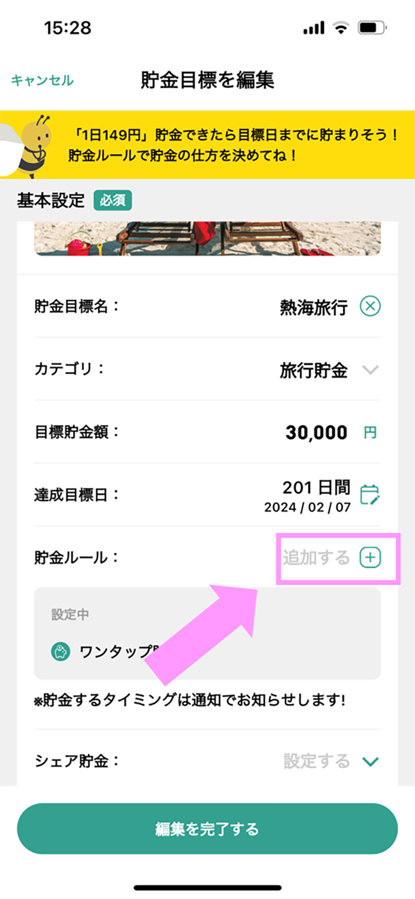 設定した目標の編集画面上で、貯金ルールの追加ボタンをタップします。