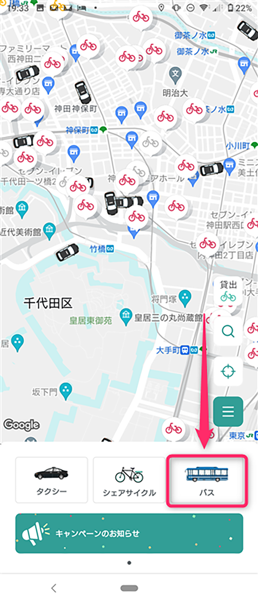 「シェアサイクル」をタップすると自転車マークが表示されるのでタップします。