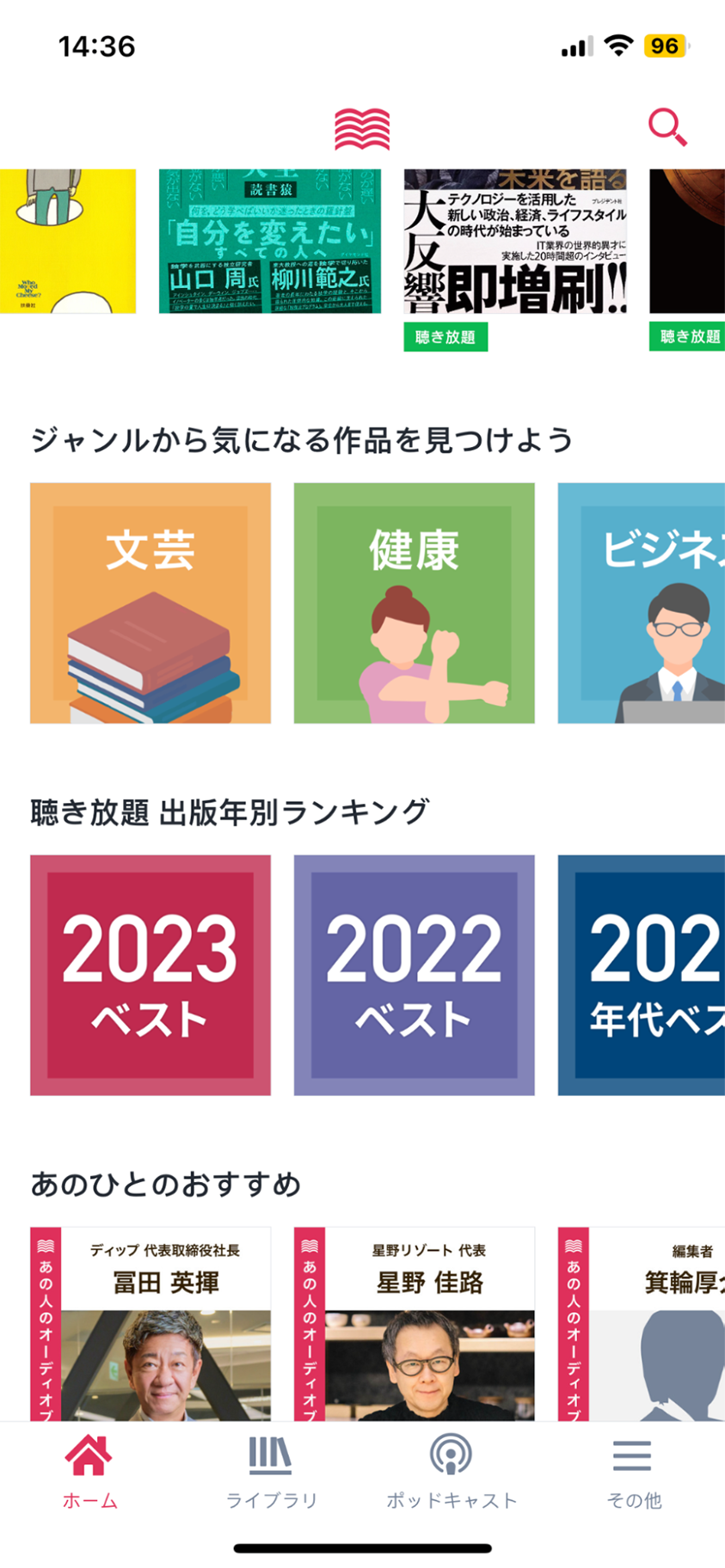 ビジネスや文芸、健康などのジャンルから検索したり、著名人おすすめの本をチェックできたりします。自分の好み以外の本を聴いてみると新たな知識が身につくかもしれません。