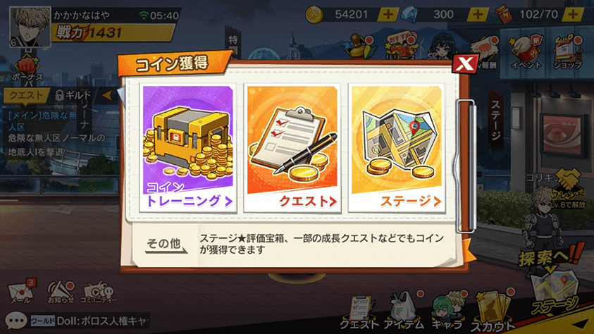 『ONE PUNCH MAN 一撃マジファイト』では、ゲーム内通貨を使って新しいキャラクターをゲットしたり、育成に必要なアイテムを購入したりできます。